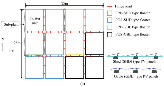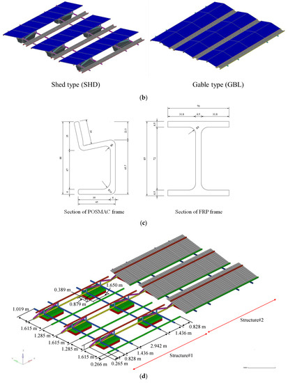 As shown in Figure 2a, the pilot floating PV power plant is composed of four sub-plants, whereas a sub-plant includes three floater units. Twelve floater units were linked with hinges. The PV modules were arranged in the shed (SHD) and gable (GBL) types (refer to Figure 2a,b) and supported by two different profiles made from fiber-reinforced plastic (FRP) and formed sheet steel called POSMAC (POS) (see Figure 2c). The FRP frame has an I-beam section as delineated in Figure 2c, while the section of the POS frame is channel type.