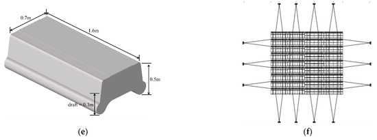 Six buoys per floater made from polyethylene (PE) support the frame structures. Seventy-two buoys were used in total. The configuration of a buoy is shown in Figure 2a,b. Four synthetic mooring lines were arranged at each side of the PV power plant where two mooring lines were anchored by a heavy concrete block (refer to Figure 2e). Table 1 lists the detailed specifications of the mooring lines and the Figure 2f presents the layout of the mooring lines.