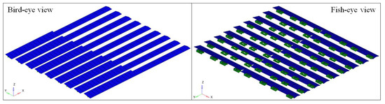 In this study, it was not necessary to use many frequencies because a single design wave was used, but a wide range of wave frequencies (0.1–7 rad/s) was used to observe motion response amplitude operators (RAOs) comprehensively (refer to Table 3). The number of frequencies was forty and ranged from 0.1 rad/s to 7.0 rad/s. Pastor and Liu [19] presented that the number of frequencies was appropriate to adequately represent most wave spectrums, and the range of frequencies was wide enough to avoid energy loss in most wave spectrums. In order to consider the viscous damping effect for roll response especially, some experimental or computational fluid dynamics simulations should be performed to obtain the relative viscous damping ratios. Consideration of viscous damping effect should reduce the motion, velocity, and acceleration of the real floating photovoltaic power plant [20]. It leads to more conservative structural analysis results. However, the viscous damping was not taken into account in this study. Environmental conditions such as water depth and seawater density are summarized in Table 4.