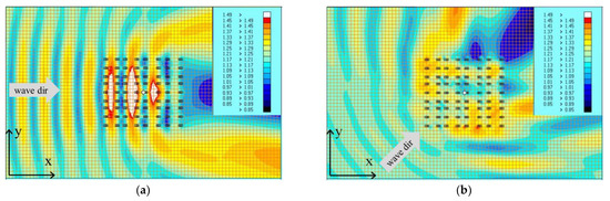 Figure 4 represents the wave elevation distribution against each incident wave angle where the diffracted waves are observed out of the global PV power plant as well as between the floater units. The trapped-wave modes between the inside floating units are highly developed when the incident waves are following and beam seas (see Figure 4a,c). The reason is that the front buoys are aligned with the rear buoys. In the case of 45°, the trapped waves hardly occur because the front and rear buoys are not perfectly aligned.