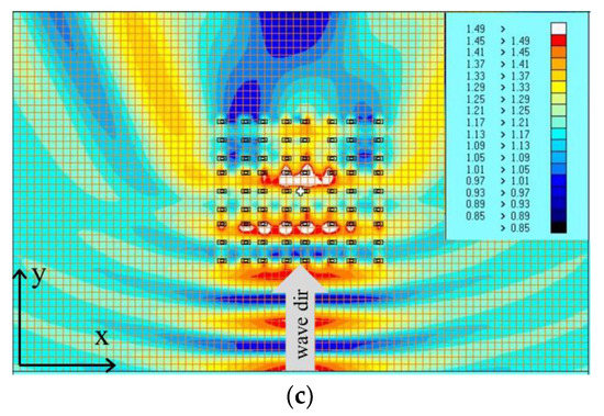 Wave elevation contour: (a) incident angle = 0°; (b) incident angle = 45°; (c) incident angle = 90°.