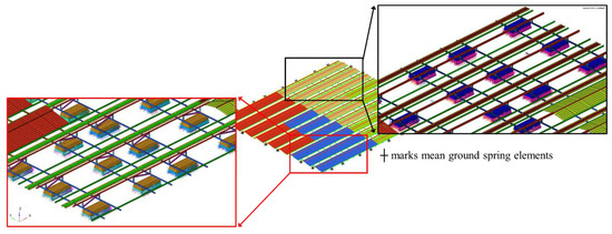 The structural analysis model was built as shown in Figure 7, where some PV modules were intentionally masked to provide better visibility of the FEA model. The density, elastic modulus, Poisson ratio, and yield strength of each material are delineated in Table 6. Some of them were taken from web searches [28]. The yield strength of the POSMAC ranged broadly from 200 MPa to 600 MPa; thus, the highest one was assumed in this study. The density of the M2 model which has even mass distribution was scaled up uniformly for all materials until the masses specified in Table 3 were obtained.