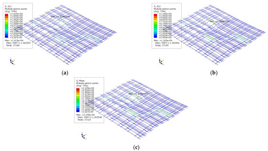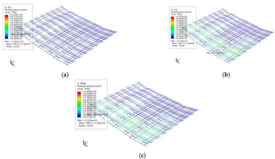 Stress distribution for the case M2-S1 (even mass and wave incident angle 0°): (a) normal stress; (b) shear stress; (c) von Mises stress.