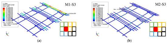 Maximum von Mises stresses in POSMAC frames: (a) M1-S3 (uneven mass and wave incident angle of 90°); (b) M2-S3 (even mass and wave incident angle of 90°).