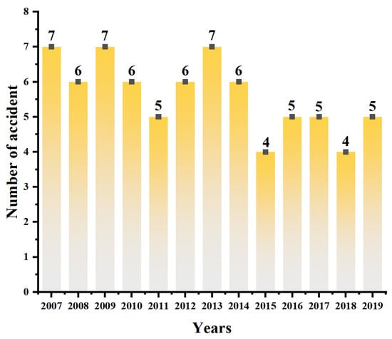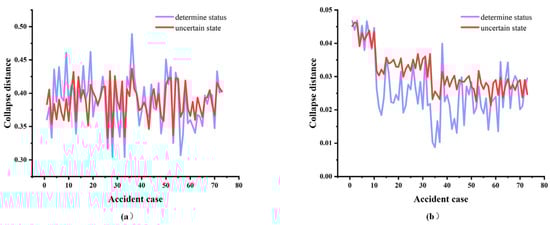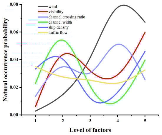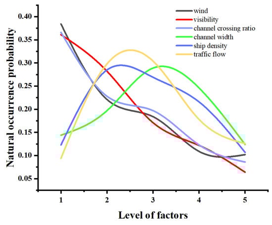 - The probabilities of the natural occurrence of key navigational environment impact factors at different levels change randomly. In accident statistics, the number of accidents at a level of a key impact factor is also random. As a result, the calculation of ultimate impact probabilities tends to be uncertain. The impact probability of all impact factors is uncertain to some extent due to the uncertainty of the impact probability distribution of a single key impact factor. However, the impact probability of all impact factors was finally determined by the ratio between the number of key impact factors at different levels as well as the probability of natural occurrence in the system. The impact probability at the levels of the adjacent extrema decreased or increased with a posterior decrease in the uncertainty. Because of this, primary attention should be given to the extrema of the impact probabilities of the key impact factors in the system when studying accident mechanisms.