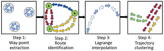 In this first phase, Maritime routes need to be extracted to be used as the baseline. To do so, previous works on extracting Maritime traffic patterns [16,22] were exploited. In these works, a series of steps were followed to extract the most commonly used vessel routes. Figure 1 illustrates these steps.