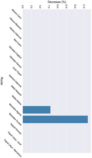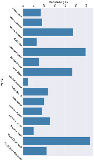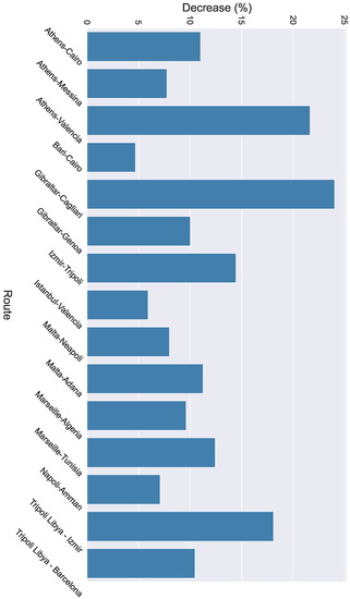 We can observe that the minimum decrease was in the route from Napoli to Amman and the maximum decrease was approximately in the route from Gibraltar to Cagliari. Furthermore, the mean decrease overall was at about . The same process was followed for the other weather thresholds as well. Specifically, for the wave period and the wind speed, we measured their mean values ( and , respectively) along the portion of the route where the adverse conditions were in effect. In the next step, we measured the mean wave period and the mean wind speed of the alternate route during the same period of time. The difference between the mean values to the initial mean values indicates the percentage of the decrease of the wave period (Equation (2)) and the wind speed (Equation (3)), respectively. The percentage-wise decrease of the wave period is demonstrated in Figure 7 and the percentage-wise decrease of the wind speed is illustrated in Figure 8 for each route.