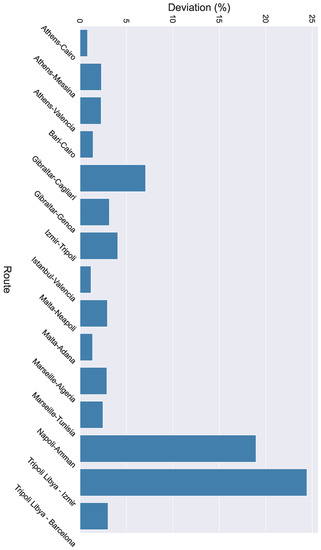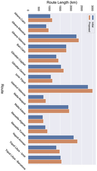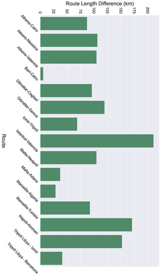 Finally, Figure 10 displays the length of the trajectories for both the initial and the recommended routes, and Figure 11 displays the difference in length between the initial and the recommended routes. It can be observed that the maximum difference in length is approximately 200 km in the case of the Istanbul–Valencia route. Taking into account that the initial route is over 2500 km, a difference of 200 km is only an ≈8% difference, which is an acceptable deviation compared to the cargo loss and potential impact on the regional marine ecology and environment.