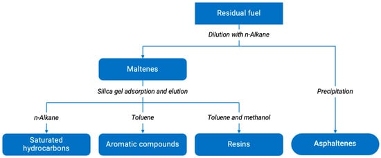 A combined gas chromatography-mass spectrometry method was used to determine the group composition of hydrocarbons. The method was put into practice through the equipment GCMS-QP2010 Shimadzu. In addition, SARA-analysis, which could be observed on the Figure 1, was performed [47,48]. SARA-analysis consists in separating petroleum products into four solubility groups: saturated hydrocarbons, aromatic compounds, resins, and asphaltenes (SARA).
