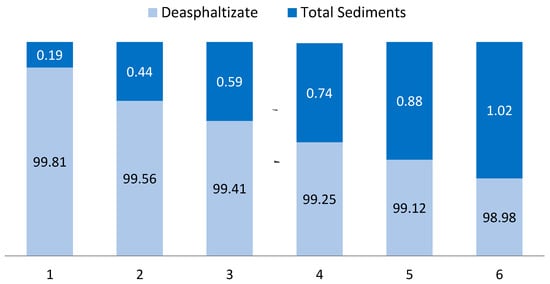 According to the results of chemical composition evaluation the C:H ratio was 8:1. This corresponds to an intermediate value between liquid petroleum fuels and petroleum carbon materials. The growth in C:H was the consequence of a decline in the concentration of H and an increase in C, which could be attributed to the so-called condensation. Polyaromatic hydrocarbons coagulate during the sediment formation, moreover, their molecular weight rose, and they represented amorphous carbon. This equates that sediment (sludge) obtained in the deasphalting procedure could be used as a component for tar and bitumen.
