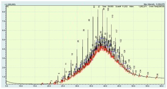 The hydrocarbon composition of the resulting liquid-phase mixture (sample dissolved in toluene in ratio 1:100) was determined by the means of the gas chromate-mass spectrometer GCMS-QP2010, concurrently substances that boil off at temperatures up to 300 °C in the chromatograph column were defined [49].