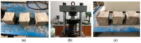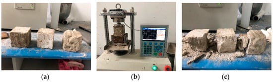 Compressive strength test of HDC. (a) Demolding form; (b) loading; (c) destruction form.