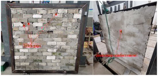 In this test, a total of four keel brick wall specimens were masoned, all of which were masoned in full compliance with the groove upward. The wall size is 1500 mm × 1500 mm × 75 mm, and the elevation of the wall specimens is shown in Figure 6. It should be noted that during the field research, it was found that the masonry mortar of the keel brick walls in the existing residential buildings had basically fallen off. Therefore, in order to more realistically reflect the mechanical properties of the existing keel brick walls, very little masonry mortar was used during the masonry of the wall specimens, and brick gaps were deliberately left, as shown in Figure 7. After the wall masonry was completed, the four wall specimens were reinforced separately. According to the reinforcement scheme, they can be divided into: 1 cm thick single-sided HDC (No. HDC1), 1 cm thick double-sided HDC (No. HDC2), 2 cm thick single-sided mortar (No. M1), and 2 cm thick double-sided mortar (No. M2). After each group of specimens was maintained for 7 days to reach the expected test strength, the lateral force loading test can be carried out.