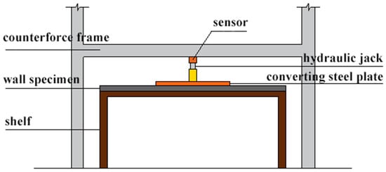 The effect of various reinforcement schemes on the lateral force resistance of keel brick walls was investigated by static loading tests. The test loading device (elevation) is shown in Figure 8, where the wall specimen was fixed on a steel frame supported around, a horizontal conversion steel plate was placed on the upper part of the wall, and a jack was placed on the steel plate. The concentrated loads applied by the jack were transformed into uniform loads applied to the wall by the steel plate, which can simulate the lateral loads applied to the wall under real conditions. The load was controlled by hydraulic jack to achieve step-by-step loading (loading amplitude of 0.5 kN) until the final destruction of the specimen.