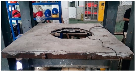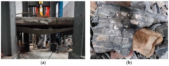 The main damage characteristic of specimen M2 was brittle damage. During the loading process, the overall deflection of the wall was not obvious, and the cracks on the lower mortar surface gradually expanded as the load increased step by step, as shown in Figure 11a, and after loading to 16 kN, the wall finally suffered brittle damage along the cracks. Figure 11b shows the damage range of the specimen M2. The main damage characteristic of specimen HDC2 was ductile damage. There was no obvious crack during the loading process, before loading to the critical damage load of 21 kN, or in the lower HDC surface layer as the load increased gradually; after loading to the critical damage load of 21 kN, the lower HDC surface appeared to obviously deflect downward. It was found by observation that the internal keel bricks had been partly detached from the wall, but the lower HDC surface pocketed the keel bricks and did not fall off due to its good ductility, as shown in Figure 12a. At this time, the second loading began, the upper HDC surface gradually deflected with the increasing load, which eventually led to the overall falling damage of the lower HDC surface, as shown in Figure 12b.