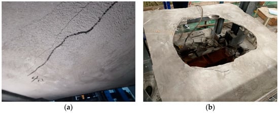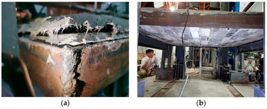 Ductile damage of specimen HDC2. (a) Downward deflection of the lower HDC surface; (b) lower HDC surface falling off.