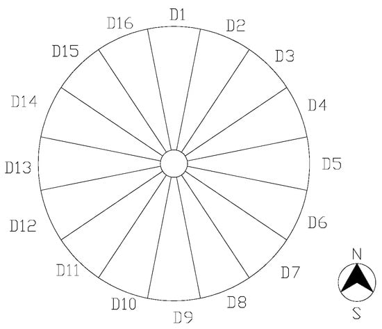 There is a need to carry out wind climate assessment to determine the multi-directional extreme wind speed at the location of the keel brick residential buildings with different return periods. The Ningbo area is influenced by East Asian monsoon and Northwest Pacific typhoon all year, which belongs to the mixed wind climate region [27]. The daily maximum wind speed data (10-min time interval) and the corresponding wind direction records of Ningbo meteorological station (58562 Yinzhou) from 1 January 1967 to 31 December 2019 were used as samples in this paper, and the data were extracted from China Meteorological Data System (http://data.cma.cn/, accessed on 1 July 2022). According to the meteorological data specification, the collected wind speed data has been carefully calibrated by adjusting the observation height, observation time interval, and so on, to the standard condition. Figure 13 shows the division of 16 wind angles. D1 is the northerly wind direction, rotated clockwise every 22.5° as a wind direction, divided into D1, D2, …, D16. The observed daily maximum 10-min average wind speed series were categorized into 16 wind direction angles. By excluding the typhoon wind speed data, the annual maximum wind speed series of constant winds in each wind direction can be filtered.