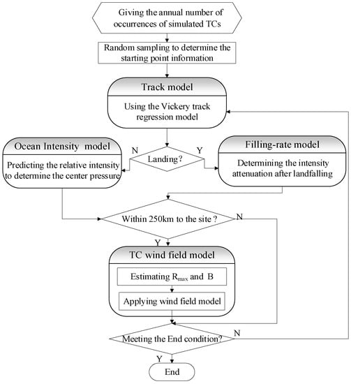 This paper adopted the typhoon full-track simulation and applied a wind field model to obtain the near-surface typhoon wind speeds affecting Ningbo area, due to the limitation of the sample size of historical typhoon wind speed observations [27,28,29]. The full-track simulation process of single typhoon is shown in Figure 14, which can be divided into four steps. A typhoon genesis is randomly chosen following the historical statistics of typhoon occurrence at the first step. Then a track model and an intensity model are used to mimic the evolution of a typhoon process at a time step of 6 h. The third step is applying a filling rate model for the landfalling segment of the track. The final step is to activate Yan Meng wind field model if the simulated typhoon is within a radius of 250 km of Ningbo area. The Vickery empirical model [30] was used to determine the values of key wind field parameters such as the maximum wind speed radius Rmax and Holland pressure profile parameter B. The roughness length was taken as 0.05 m. Six-hundred-year Monte Carlo simulations were conducted to ensure enough annual extreme values for statistical analysis so as to estimate the typhoon climate in Ningbo area; the specific procedures can be referred to the literature [24,27,28,29].