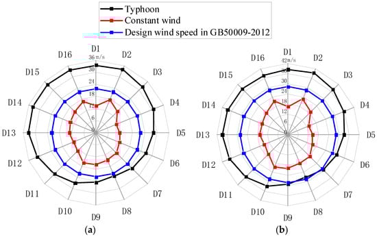 Based on t-Copula function, the joint probability distribution models of annual maximum wind speed series of constant wind and typhoon under 16 wind directions were constructed, respectively, and the multi-directional extreme wind speeds under different return periods were calculated by using this joint distribution model, and the specific procedures can be referred to the literature [27,33].