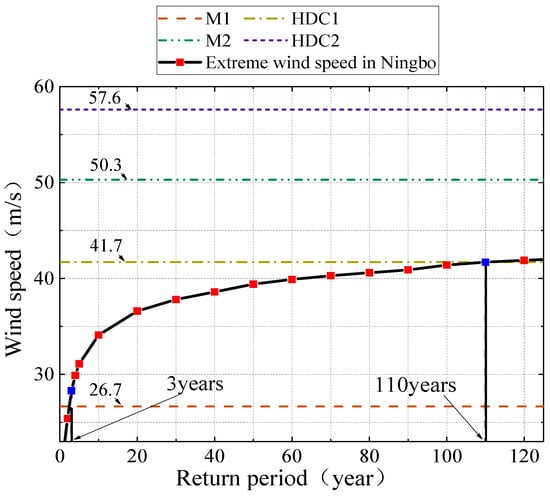 Extreme wind speeds in the most unfavorable wind direction (D2) corresponding to different return periods in Ningbo.