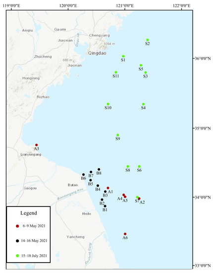 Distribution of green tide outbreak sampling sites in the Southern Yellow Sea in 2021. Different colors represent different sample collection times. Red represents samples collected from 6 May 2021 to 9 May 2021, black represents samples collected from 14 May 2021 to 16 May 2021, and green represents samples collected from 15 July 2021 to 18 July 2021.