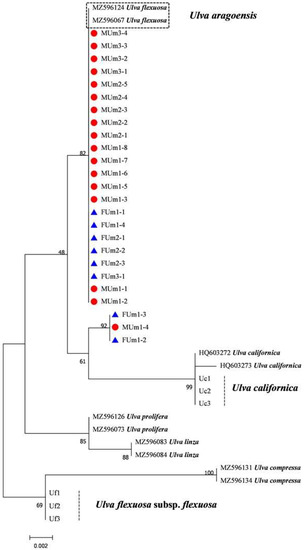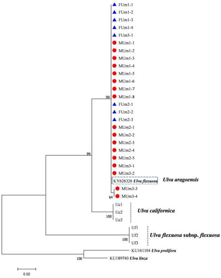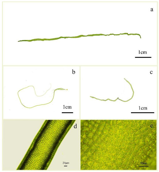 - Hayden, H.S.; Blomster, J.; Maggs, C.A.; Silva, P.C.; Stanhope, M.J.; Waaland, J.R. Linnaeus Was Right All along: Ulva and Enteromorpha Are Not Distinct Genera. Eur. J. Phycol. 2003, 38, 277–294. [Google Scholar] [CrossRef]