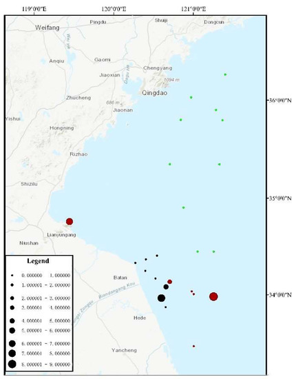 In addition, floating green macroalgae were collected at each sampling point (Figure 1) and transported back to the laboratory at 4 °C. After removing miscellaneous algae from the surface of the macroalgae with a brush in the laboratory, the samples were cleaned with sterilized seawater, dried with absorbent paper (Vinda, Jiangmen, China), and stored in a refrigerator at −80 °C.