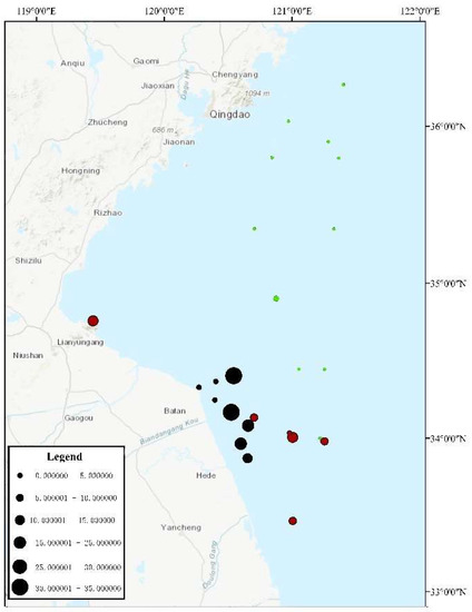 Percrntage of U. aragoensis in the floating green macroalgae. Circle size represents the proportion of U. aragoensis. Different colors represent different sample collection times. Red represents samples collected from 6 May 2021 to 9 May 2021, black represents samples collected from 14 May 2021 to 16 May 2021, and green represents samples collected from 15 July 2021 to 18 July 2021.