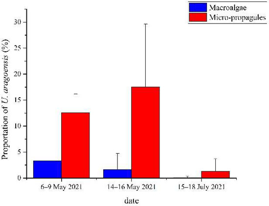 Average proportion of U. aragoensis in the floating green macroalgae and micro-propagules in the three surveys (6–9 May 2021, 14–16 May 2021, and 15–18 July 2021).