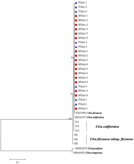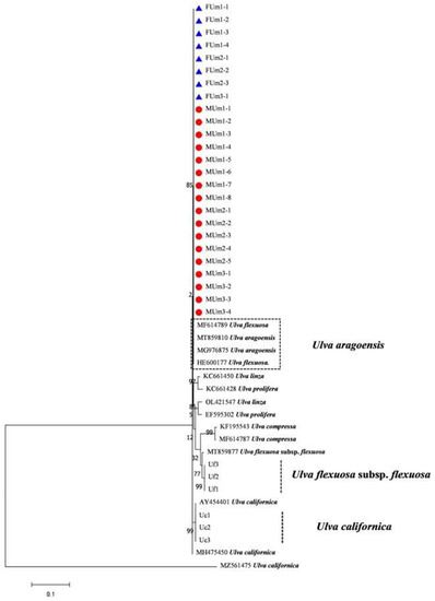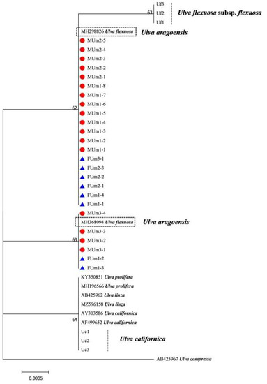 - Wang, J.F.; Li, N.; Jiang, P.; Boo, S.M.; Lee, W.J.; Cui, Y.L.; Lin, H.Z.; Zhao, J.; Liu, Z.Y.; Qin, S. Ulva and Enteromorpha (Ulvaceae, Chlorophyta) from Two Sides of the Yellow Sea: Analysis of Nuclear rDNA ITS and Plastid rbcL Sequence Data. Chin. J. Oceanol. Limnol. 2010, 28, 762–768. [Google Scholar] [CrossRef]