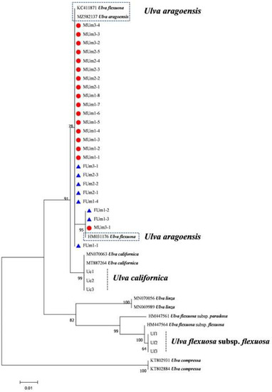 - Shimada, S.; Hiraoka, M.; Nabata, S.; Iima, M.; Masuda, M. Molecular Phylogenetic Analyses of the Japanese Ulva and Enteromorpha (Ulvales, Ulvophyceae), with Special Reference to the Free-Floating Ulva. Phycol. Res. 2003, 51, 99–108. [Google Scholar] [CrossRef]