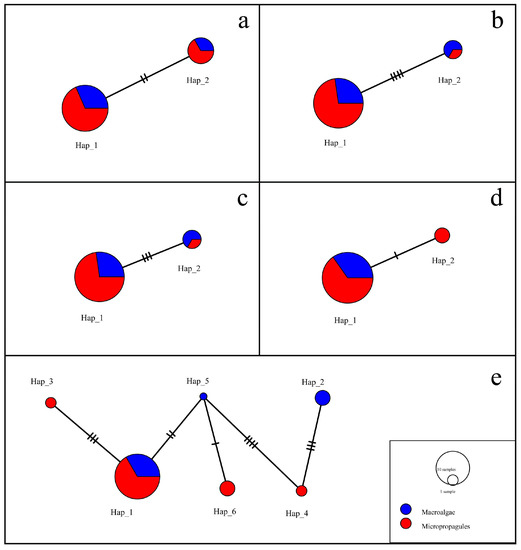 According to the sample source, the sequences were divided into floating macroalgae species or micro-propagule populations. Because the sequences of rbcL, tufA, and psbA of the 25 samples were completely consistent, haplotype analysis could not be carried out. Therefore, a haplotype analysis was performed on the sequences of the four different primers (18S, ITS, LSU, and rps2-trnL). The sequences of the four primers were divided into two haplotypes, and the differences between the two haplotypes were small (Figure 13a–d). The rps2-trnL sequences had the smallest difference and the LSU sequences had the largest. The two haplotypes of the 18S, ITS, and LSU sequences contained both macroalgae samples and micro-propagule samples, while the rps2-trnL sequences contained only two different sources of samples in Hap_1 and only micro-propagule samples in Hap_2, which may be the reason for the small number of samples of floating U. aragoensis.