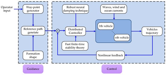 The research on vehicle formation has been developed to some extent [3,4,5,6]. Its control objective is to drive a group of ASVs converged to an anticipated geometric formation with a desired heading angle. To obtain the predefined formation, the mainstream formation control methods in the existing literature are the leader-follower approach [7,8], the virtual structure approach [9], the behavioral-based approach [10] and the graph theory-based approach [11]. In addition, the above formation methods present a mixed development state in recent years, which effectively promote the further development of formation control. In [12], novel sliding mode control laws are proposed to control multiple surface vehicles with arbitrary formations. Xiang et al. [13] developed a nonlinear controller for formation coordination to avoid collision with a certain formation. Moreover, a leader-follower formation tracking approach with limited torque was developed for tackling actuator saturation. Considering accurate formation in [14], Xiao et al. [15] designed a novel disturbance estimation scheme for the formation controller based on a terminal sliding mode observer. In [4], a practical coordinated path-following algorithm was presented for a group of underactuated surface vehicles to achieve and maintain the desired formation pattern. For the multi-input and multi-output system, a traditional adaptive control approach was designed in the presence of the amplitude and rate saturation in [9].
