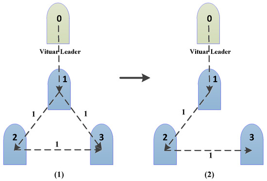 is a column of vectors, which is used to describe the existence of information connectivity between ith vehicle and leader. When the ith vehicle can receive the information from the leader, , otherwise . Here, the leader and vehicles in the formation are constructed into a directed graph.