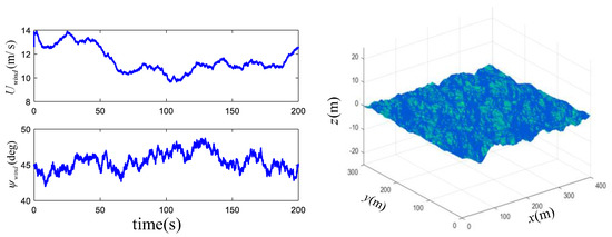 The RBF NNs for and include 32 nodes, , the centers spaced in [−10 m/s, 10 m/s] for and [−2.5 rad/s, 2.5 rad/s] for and widths . For the external disturbances, the ASVs inevitably encounter the disturbance of wind and wind-generated waves in the course of navigation. This paper adopts a physical-based mathematical model to reflect the actual environment. The NORSOK wind and the JONSWAP wave spectrums are adapted to produce these two disturbances, which have been defined as an International Towing Tank Conference standard. Figure 4 describes the wind conditions (e.g., the speed is about 12.25 m/s and the direction is about 45 deg) and wind-generated waves in the simulation experiment. As for the current perturbation, the speed m/s and the direction . These disturbances exert influence on the underactuated ASVs through a certain mechanism, and the detailed descriptions of the impact method are illustrated in book [27]. For adjusting the parameters more conveniently in the application, the three ASVs in this simulation use the same set of controller parameters. The main controller parameters adjusted properly are selected as Table 1.