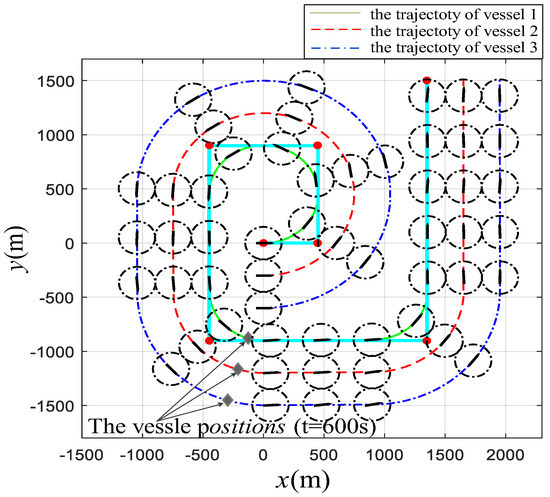 Additionally, is a used to describe the communication ability between the vehicle and leader; following Remark 2, the leader’s path is composed of path planning based on waypoints, with details such as in article [26]. The geometric formation is constructed by the distances in X and Y directions between vehicles, and the relative distances between vehicles are given as ; ; . Moreover, the initial positions and orientations of the three ASVs are designed as Equation (39).