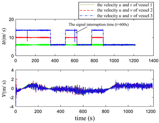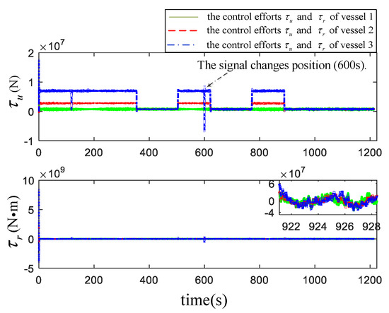 Based on the above configuration, the numerical simulation results are shown in Figure 5, Figure 6, Figure 7, Figure 8, Figure 9 and Figure 10. Figure 5 is the navigation chart of ASVs formation under the proposed control scheme. The navigation path for ASVs formation is expanded by concentric square, the circles (with a radius of 150 m) in figure is the search radius. Figure 6 demonstrates the tracking errors , and , the fluctuation of the errors curve in the figure is caused by the turning of the ASVs formation. When the information is interrupted at 600 s, the positions errors and have a sudden change, which is consistent with the description of Equation (6) combined with the ASVs’ position at 600 s in Figure 5. In Figure 6, other places are continuous except that the error at the signal interrupt is discontinuous. During the turning, the surge speed of the vehicle outside the circle is larger than that of the inner circle to achieve the formation turning behavior; the action is described in Figure 7. In addition, there exists a decline in the surge velocity of second and third vehicles at the time 180 s, which is different from at 600 s. For Figure 8, we can see that one of the changes in the adaptive parameters related to surge and yaw velocity, and the fluctuation time is the same as that of surge and yaw velocity, which is reasonable for this phenomenon to appear in the course of a formation system turning. Figure 9 shows the control efforts and of the three ASVs with the proposed algorithm.