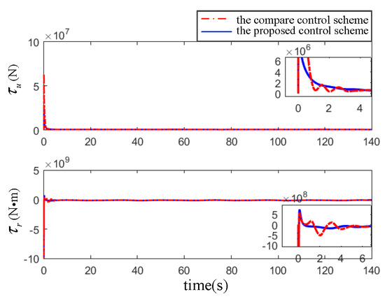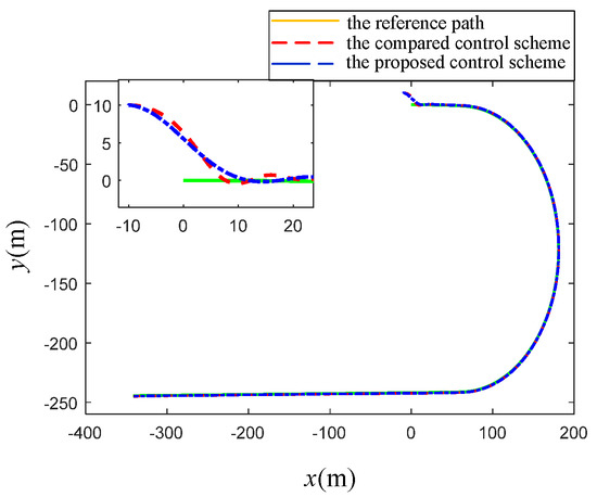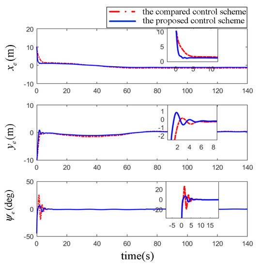 Figure 10, Figure 11 and Figure 12 and Table 2 show the results of the comparison simulation. To better reflect the comparison results, three performance indexes in Table 2 are employed to display the advantages and disadvantages of the two algorithms, e.g., the mean absolute error (MAE), the mean absolute control input (MAI) and the adjustment time (AT). MAE is used for evaluating the control accuracy of control algorithm. MAI is for properties of energy consumption and smoothness; the two indicators are calculated as Equation (41). In addition, AT represents the time from the initial state to the steady state of the errors, which can directly reflect the convergence performance.