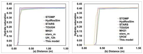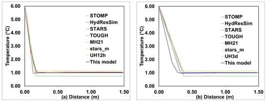 Hydrate saturation results compared with other simulators after (a) 12 h and (b) 72 h. Figure 2. Temperature results compared with other simulators after (a) 12 h and (b) 72 h.