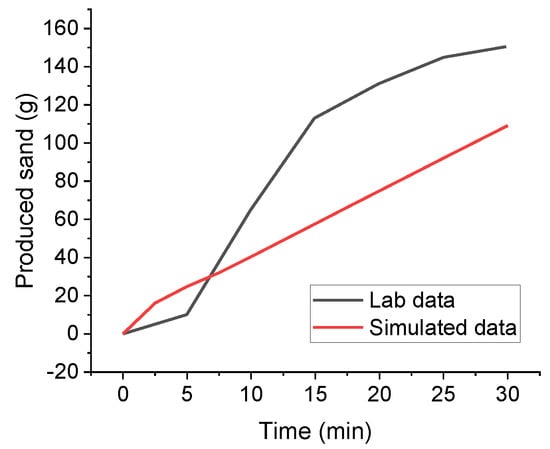 After the verification of hydrate saturation and temperature results, the sand production results are verified against lab data. The lab setup from Ding et al. [] are reproduced in the numerical model and simulated sand production results are obtained. In Figure 3, it is noted that the simulated data are of the same order of magnitude.
