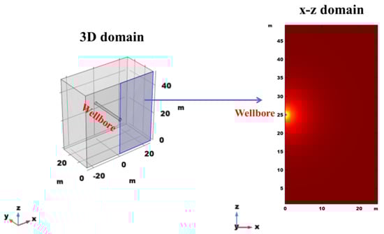 A synthetic case is built for numerical analysis. As shown in Figure 4, a horizontal well depressurization scenario is considered. Due to symmetry, a two-dimensional x–z plane is simulated. The horizontal wellbore is location at x = 0 m and z = 25 m. The parameters in the model are based on several published datasets [,,]. In the base case, essential simulation parameters are documented in Table 1. Since the studied layer is relatively localized, the pressure and stress gradients are neglected, while the effect of gravity on porous media flows is honored. In the x–z plane, the plane strain assumption is used.