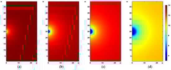 Temperature (K) distribution after (a) 1, (b) 5, (c) 10, and (d) 30 days.