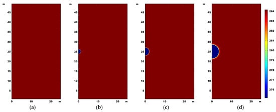 In Figure 6, the distribution of temperature within the domain is plotted. After one day of depressurization, the change in temperature is not significant and the temperature drop is barely noted in the domain. This is because the hydrate dissociation process on the first day is not significant, and the associated endothermic process is preliminary. After five days of depressurization, the temperature change becomes more noticeable, and the temperature drop front can be clearly observed in the near-well area. The temperature distribution results on days 10 and 30 show that the temperature drop front moves gradually with depressurization time. It is also noted that the temperature drop fronts are sharp at the four different time steps, indicating that the effect of heat absorption is relatively localized. Compared with Figure 5, although both temperature drop and pressure drop fronts are nearly circumferential, it can be noted that the temperature drop front travels much slower than the pressure drop fronts.