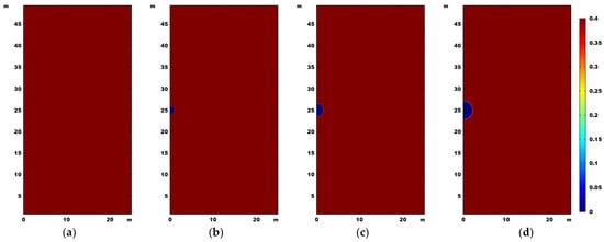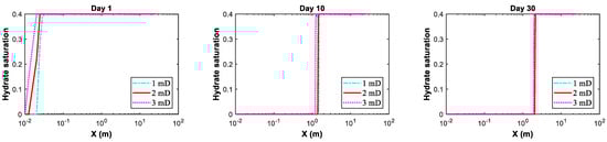 The hydrate saturation distribution in the x–z domain after horizontal well depressurization is shown in Figure 7. It is noted that the hydrate saturation changes are sharp, corresponding to hydrate dissociation fronts. After one day, the hydrate saturation change is not clearly observed; after five days, the hydrate saturation change becomes noted, indicating that the hydrate dissociation front is gradually propagating. When the depressurization time increases to 10 and 30 days, the corresponding hydrate dissociation fronts move further. Based on the comparison between Figure 6 and Figure 7, it can be noted that the hydrate dissociation fronts move slower than temperature drop fronts. This is because the hydrate dissociation process absorbs heat even before hydrates are completely dissociated, and the areas beyond hydrate dissociation fronts can experience temperature drops. In the x–z plane, the hydrate saturation drop fronts are also nearly circumferential as for temperature and pressure drop fronts. This is because the hydrate dissociation process is strongly coupled to the thermodynamic changes in the domain, while the thermodynamic changes are induced by horizontal well depressurizations.
