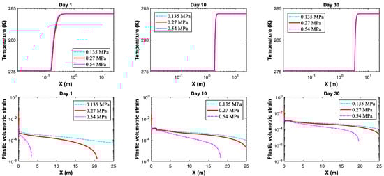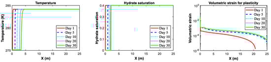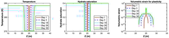 To better present the distribution of dependent variables within the x–z domain, one-dimensional line plots are provided along z = 25 m and along x = 0 m as shown in Figure 4. Note that the plastic volumetric strain is obtained as the trace of the plastic strain tensor, and it is used to quantify the permanent deformation volumetrically. Figure 10 shows the 1D distribution of temperature, hydrate saturation, and volumetric strain for plasticity along z = 25 m, and the distribution is in the x direction. The temperature distribution curves directly present the temperature drop fronts on days 1, 5, 10, 20, and 30. It shows that the temperature changes are sharp and the endothermic process is drastic. After 30 days, the temperature drop front moves to about 4 m away from the horizontal wellbore. The hydrate saturation curves indicate the extent of hydrate dissociation. A depressurization period of 30 days makes the hydrate dissociation front move around 2 m away. Moreover, areas with hydrate dissociation are not as extensive as those with temperature drops, as heat transport can happen beyond the dissociation fronts of methane hydrates. The volumetric strain is also plotted along the one-dimensional domain for the five different time steps in a semi-log plot. Specifically, plastic strain results are evaluated volumetrically, which implies permanent deformation caused by the exploitation of methane hydrates in the sediments. In the results, as time increases, plastic volumetric strain monotonically increases, and the wellbore has the highest plastic volumetric strains due to drastic physical changes. As it moves away from the horizontal wellbore, permanent deformation becomes less significant. The curve on day one indicates that the plastic strain is zero beyond x = 20.5 m. Plastic strains on days 5, 10, 20, and 30 are all non-zero, indicating that permanent deformation is observed in the entire domain. Plastic strain curves have sudden changes at locations corresponding to hydrate dissociation fronts, indicating that hydrate dissociation has a direct impact on plastic deformation in sediments.