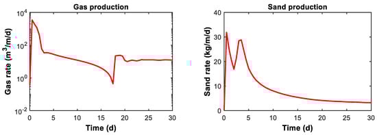 Figure 12 shows the gas production and sand production in the base case. Since a two-dimensional simulation is conducted, the production rates are prescribed in a plane. Gas rates are plotted with a semi-log scale. During the 30-day production, the gas production rate increases significantly in the first several days. Gas production rates then drop rapidly, and they become relatively stable in the end. Sand production rates reach their peak in the first days. The greatest sand rate reaches 32 kg/m/d, which corresponds to a daily sand production of 0.014 m3 per meter of the horizontal wellbore. Then, sand rates fluctuate between 16 kg/m/d and 29 kg/m/d. Afterward, sand rates monotonically decrease and finally reach a stable level. Gas and sand production rate results indicate that, due to the complicated coupling nature between the thermal, hydraulic, mechanical, and chemical processes during depressurization in methane hydrates, gas and sand rates are not monotonically decreasing with time. They are jointly affected by the multi-physical process. As a reference, the Mallik site reported 5 m3 sand production in about 24 h, and the Nankai Trough site reported 27 m3 sand production in 6 days. The well in the Mallik case has a producing interval of 12 m and the Nankai Trough case has a producing interval of about 40 m [,]. If these results are normalized to 2D, the normalized Nankai Trough sand rate is 259 kg/m/d and the normalized Mallik sand rate is 958 kg/m/d. The sand rate in this study is lower than the that of the Mallik and Nankai Trough cases, and it is in accordance with the observation in Ye et al. [] that insignificant sand production was reported.