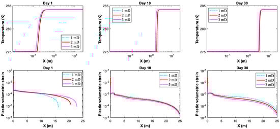 Figure 13 shows the distribution of hydrate saturation, temperature, and plastic volumetric strain in the x direction after 1, 10, and 30 days of depressurization. They are plotted along z = 25 m where the horizontal wellbore is located. Semi-log plots are used for plotting the curves. After one day, hydrate dissociation is nearly nonexistent, and the hydrate dissociation fronts barely move on the semi-log scale. On days 10 and 30, the effects of permeability on hydrate dissociation fronts are not significant. Similarly, although temperature drop fronts move away from the horizontal wellbore with time, the temperature drop is not significantly affected by permeability neither. This is because hydrate dissociation front movement and heat transport are closely related to the endothermic hydrate dissociation process, and this process is less affected by permeability. Permeability governs the fluid flow within the porous hydrate-bearing sediments, while it is not directly coupled with the kinetics of hydrate decomposition. The plastic volumetric curves indicate that, after one day of depressurization, the effects of permeability in near-well areas are insignificant. Note that areas with no plastic deformation do not have plastic volumetric strain values plotted in the curves. In contrast, in the scenario with the highest permeability, the plastic region is the most extensive, and the scenario with the lowest permeability has the smallest plastic region. This is because a higher permeability leads to a faster pressure drop front movement, which causes a strongly coupled flow and mechanical response in the sediments. This indicates that the effect of permeability on plasticity is primarily observed in the far field. As depressurization time increases to 10 and 20 days, this effect largely weakens. Another phenomenon is that the plastic volumetric curves exhibit stepwise patterns, and the steps basically correspond to the hydrate dissociation fronts. This is because hydrate dissociation weakens the strength of the skeletons in sediments, which makes it easier for the solid phase to enter plasticity. In consequence, areas beyond hydrate dissociation fronts have smaller plastic strains, implying that undissociated areas have less permanent damage caused by depressurization.