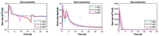 In Figure 14, the effects of permeability on gas production rate and sand production rate are compared. Permeability affects the gas production trends. When the permeability is 1 mD, the gas production rate peaks right after the beginning of depressurization and drops to a relatively stable one. As the permeability value increases to 2 mD and 3 mD, there is a temporary sudden decrease in the gas rate before it finally becomes stable. This can be explained by the fact that a higher permeability results in faster hydrocarbon drainage in near-well areas with dissociated hydrates. If the drainage of methane is faster than the generation of methane from hydrate dissociation, a sudden decrease in gas production rate can occur. Specifically, the occurrence of this sudden decrease in the 3 mD scenario is earlier than in the 2 mD scenario. This is because a 3 mD permeability leads to stronger hydrocarbon drainage than the 2 mD scenario. Since permeability does not have a significant impact on hydrate dissociation, the two permeability scenarios have very similar hydrate dissociation rates. Therefore, faster methane drainage makes the sudden decrease in gas rate occur earlier. The Cartesian plot for gas rates in Figure 14 can better exhibit the significant effect of permeability on early-stage gas production performance.
