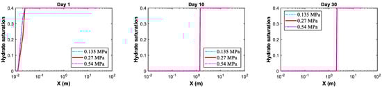 Since the depressurization process in methane-hydrate-bearing sediments is a coupled process, the depressurization-induced geomechanical changes are also reported. In Figure 8, stresses in the x direction  are plotted on days 1, 5, 10, and 30. Since the reported stress is total stress, it includes terms of pressure and effective stress in the x direction. Results indicate that the near-well areas have decreased , which is caused primarily by the significant decrease in pressure.