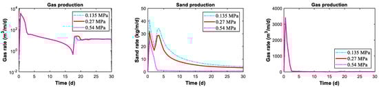 Figure 16 compares the gas and sand production rates in scenarios with several studied cohesions. The gas production rate curves show that there is a nearly negligible effect of cohesion on gas production trends, as cohesion is more related to the geomechanical responses than the thermodynamic process. However, it is observed that the effect of cohesion is significant on the sand production trends. In the scenario with the highest cohesion of 0.54 MPa, the peak sand production rate is the lowest in all three scenarios. The stable sand production rate after 5 days is relatively low. In contrast, the other two scenarios with smaller cohesion values have higher sand production rates, and after the peak sand production in the early stages, the 0.135 MPa cohesion scenario has the highest overall sand production curve of the cohesion scenarios. It indicates that the effect of cohesion on sand production exists in both the short term and the long term. Results indicate that sand production is sensitive to the rock mechanical property of cohesion.